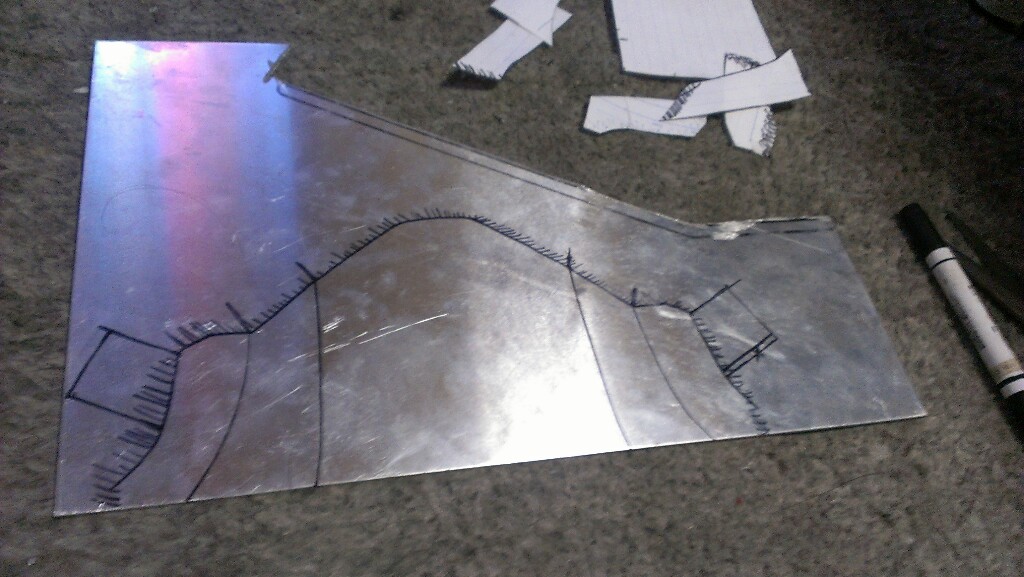 これをマジックで写した後、アルミ板の線をなぞってけがいてます。