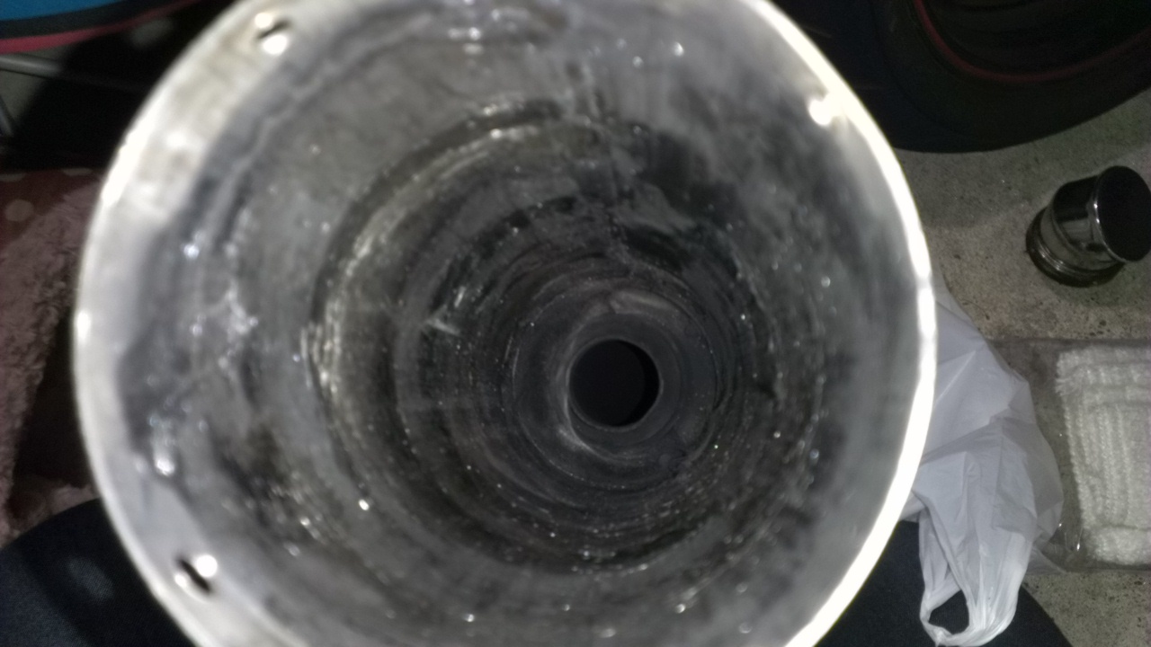 中に突き出したパイプ構造が消音には良いのかもしれないが、排気効率として見ると悪さをしているような…。