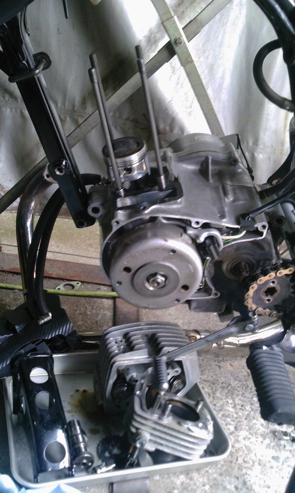 腰上の高さが低い50ベースなので、今回もエンジンマウントの後ろ下側だけを残してヘッドとシリンダーを抜く。