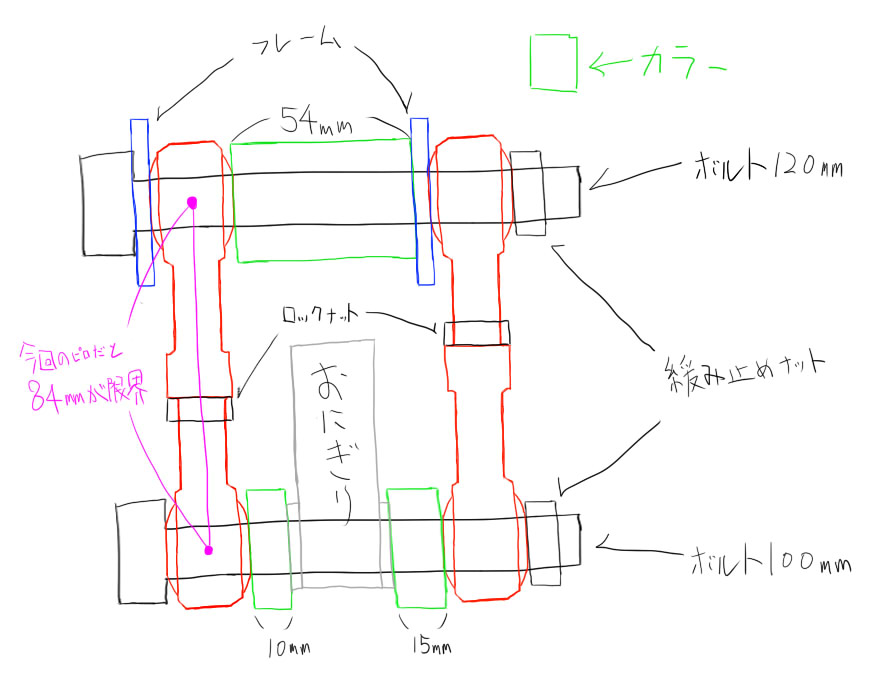 隙間埋めのカラー長さや取り付け位置、ボルトの長さなど多くの点が変わりました。