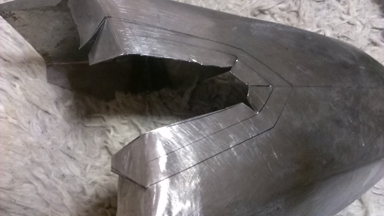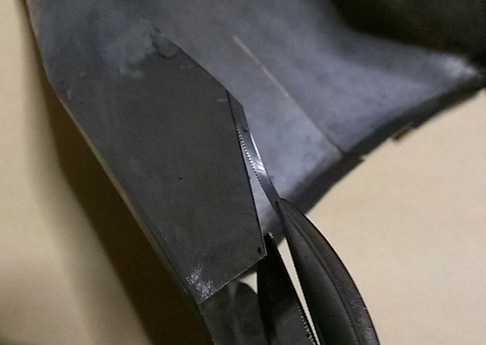 裏板が付く板金カウル側の縁はまだ左右でラインがちぐはぐですが、溶接も済んだのでようやくカットして揃える事が出来ます。