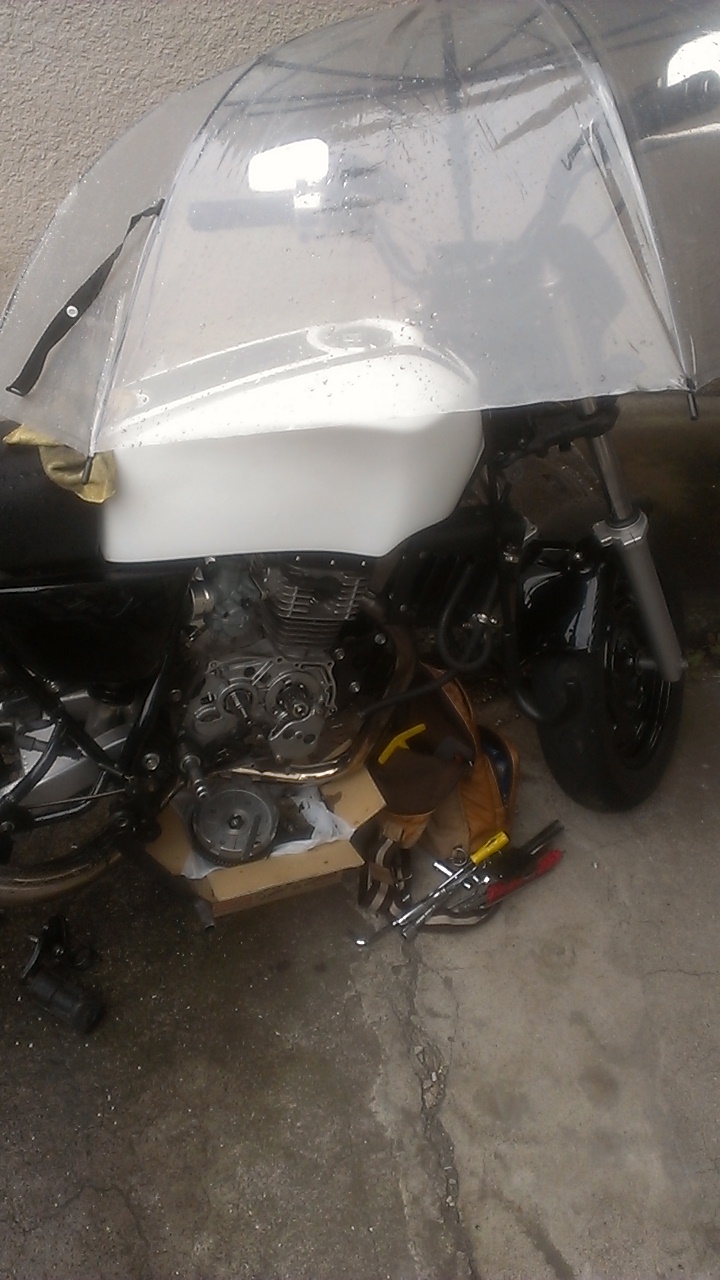 天気が悪いけれど、そんなに時間はかからないから決行!なんて言いながら始めたら、クラッチカバーが外れた所で雨が(^_^;)