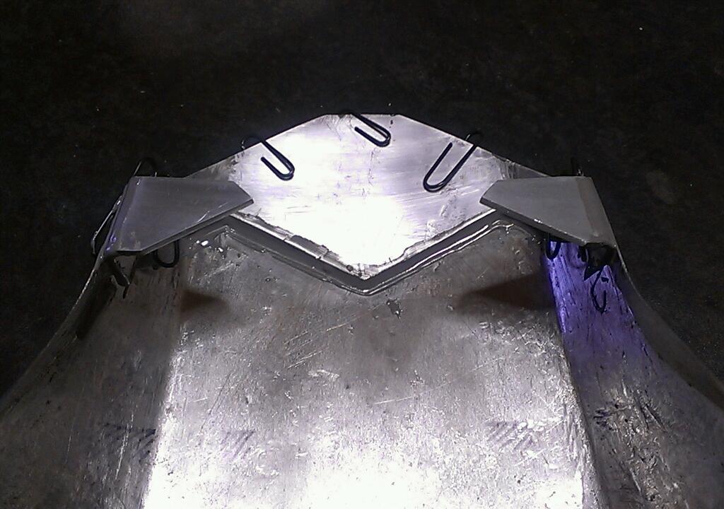 2〜3mmのアルミ板を使い、内側に合うように軽く叩いて整形、それを接着剤でくっつける予定。