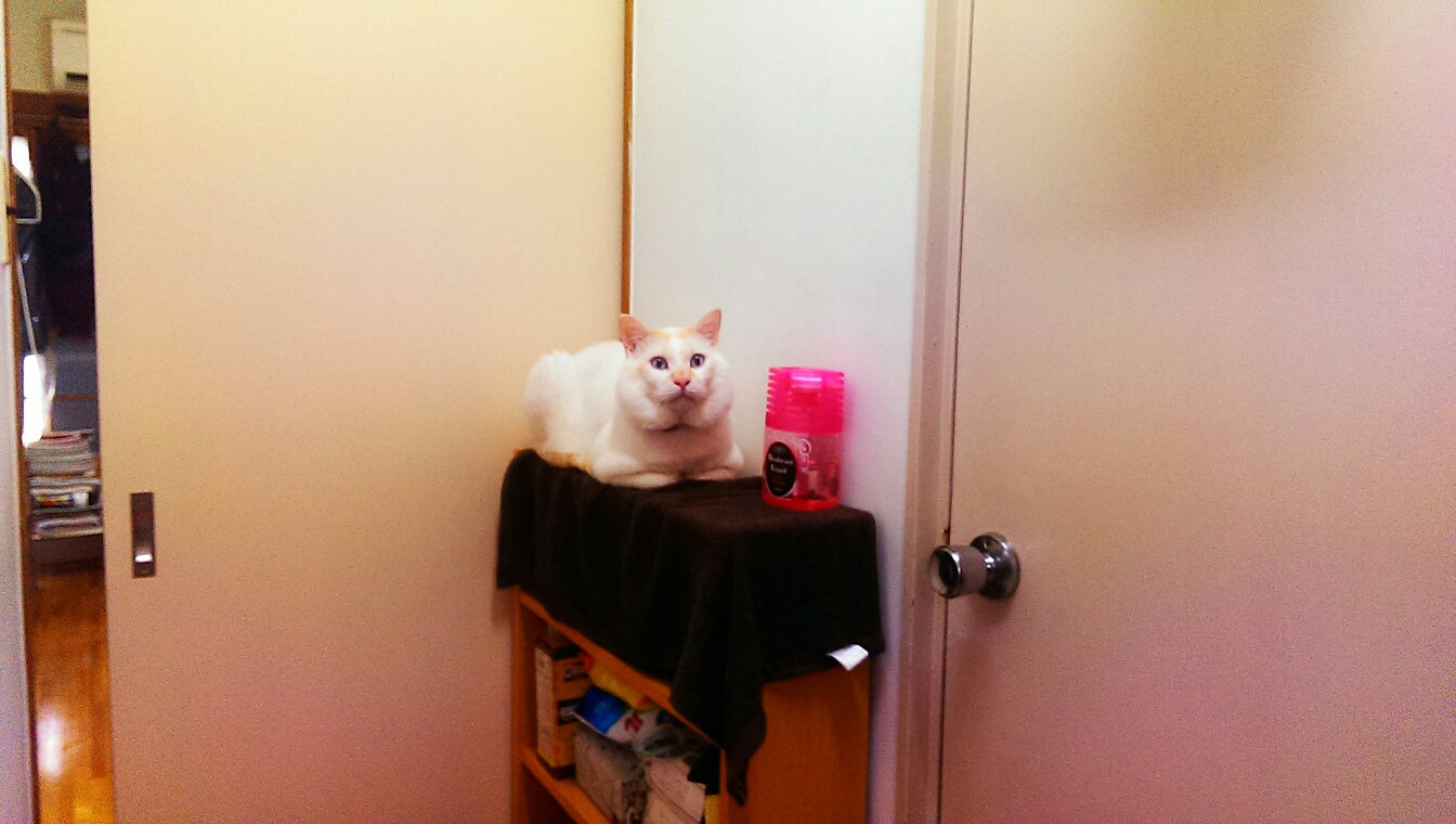 我が家の主、白猫ミルクの鼻ちょん挨拶にしっぽボワ〜。