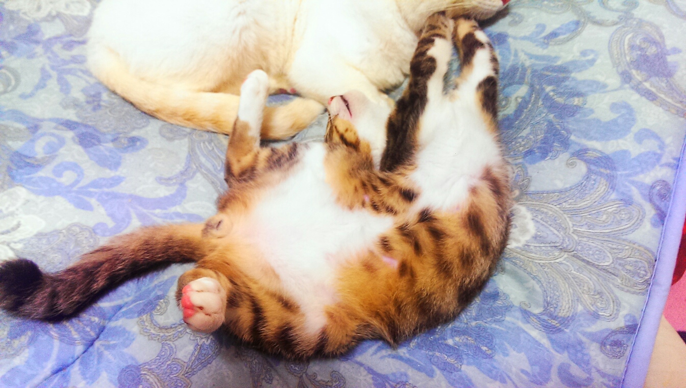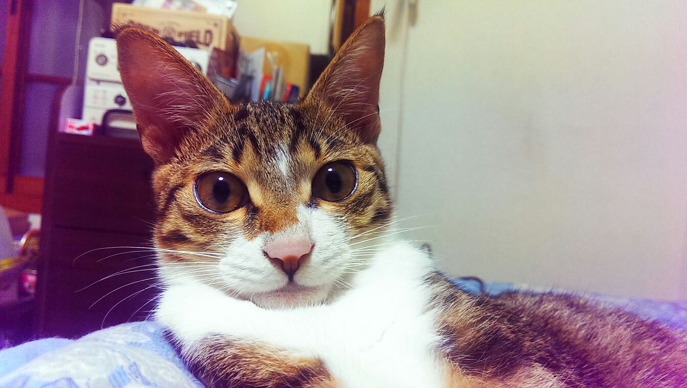 ベタベタしない、さりげなく横にいる、狩猟本能強い、遊び好き、箱や毛布、新聞紙の下に走り込む、気に入ったオヤツが出ると喋りながら食べるニャムニャム猫になる、普段はとても静か。